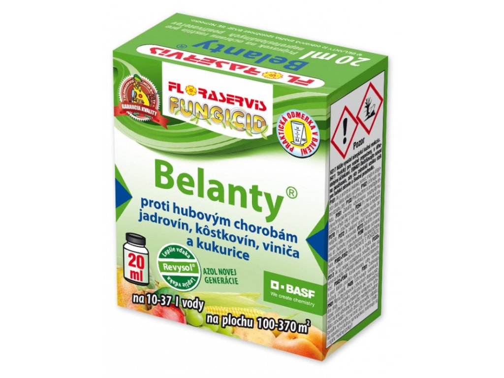 BELANTY 20ml je postrekový fungicídny prípravok vo forme kvapalného suspenzného koncentrátu (SC) na riedenie vodou. Je určený proti hubovým chorobám kukurice, viniča, jadrovín a kôstkovín a je povolený aj pre neprofesionálnych používateľov v záhradách a predzáhradkách. Obsahuje účinnú látku mefentrifluconazole 75 g/l (FRAC 3).