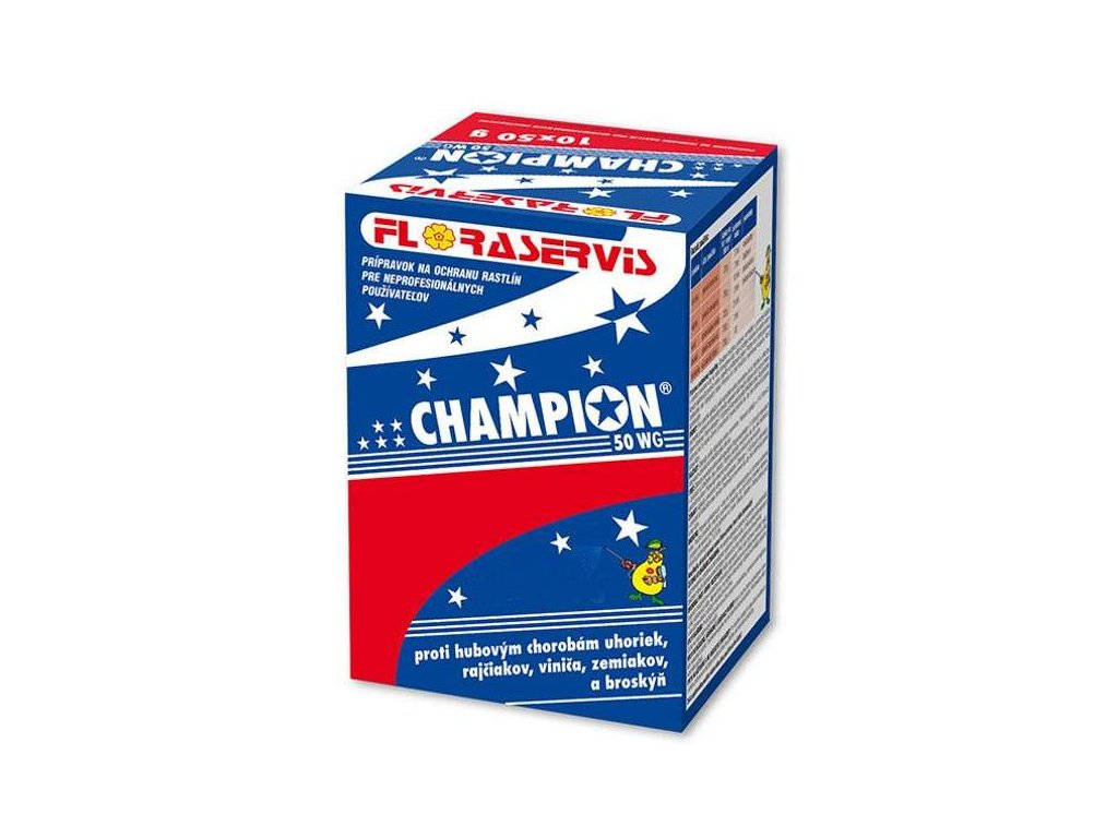 Champion 50 WG je kontaktný meďnatý fungicíd vo forme vodou dispergovateľných granúl (WG), určený na ochranu rajčiaka, uhoriek, viniča, zemiakov a broskýň proti dôležitým hubovým a bakteriálnym chorobám. Obsahuje účinnú látku hydroxid meďnatý, ktorá na povrchu rastlín vytvára viditeľný ochranný medený film odolný voči zmytiu dažďom.