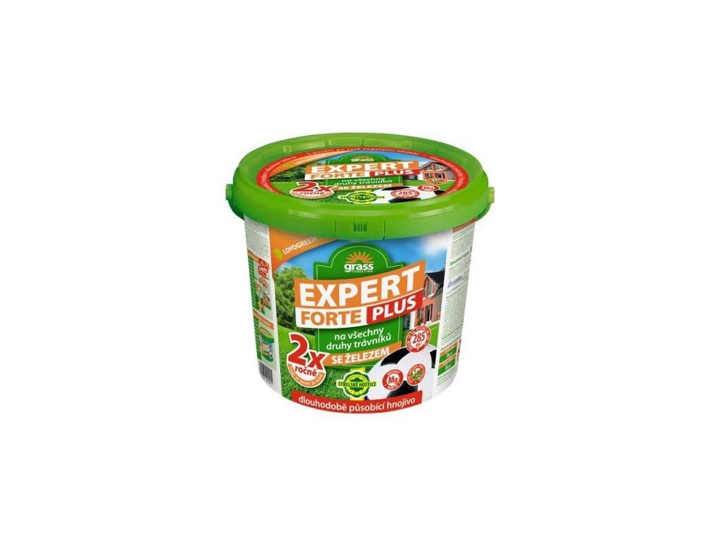 EXPERT FORTE PLUS je špeciálne granulované hnojivo so stopovými prvkami určené na hnojenie trávnikov strednej a vysokej intenzite ošetrovania. Dusíkatá zložka zaisťuje pozvolné uvolňovanie dusíku v období 2 až 3 mesiacov v závislosti na poveternostných vplyvoch. Pre dostatočné zásobenie trávnika živinami postačujú 2 dávky hnojiva behom vegetácie. Železo potlačuje výskyt machu v trávnikoch.