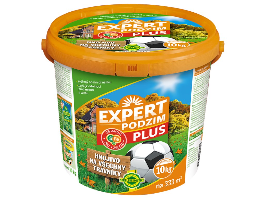 EXPERT PODZIM PLUS je granulované hnojivo, vhodné pro podzimní a pozdní podzimní hnojení všech druhů trávníků. Zvýšeným obsahem draslíku (K) se zabezpečí vysoká odolnost trávníku proti vymrzáni a napadení houbovými chorobami, které se šiří hlavně pod sněhovou pokrývkou. Použitím tohoto hnojiva na začátku léta (červen), se zvýší odolnost trávníku proti suchu v průběhu letních měsíců. Jemná granulace, potlačování mechu v trávníku.