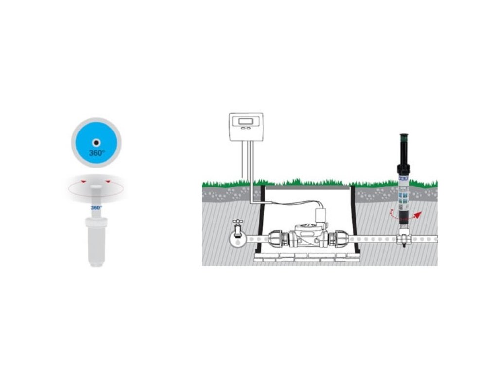 Postrekovač výsuvný 360° 1/2". Vhodný na zabudovanie do automatických zavlažovacích systémov.Dostrek 3,9 až 4,6 metra, zavlažovací uhol 360o, výsuv 10 cm, pripojenie vnútorný závit 1/2", prietok 10-14,2 L/min.
