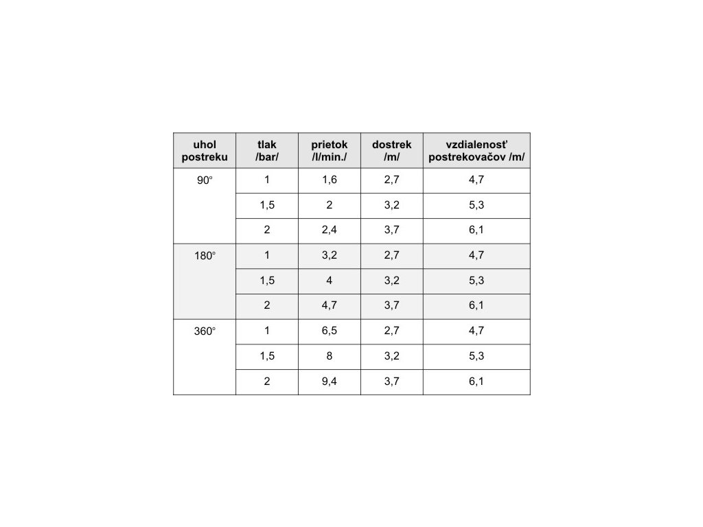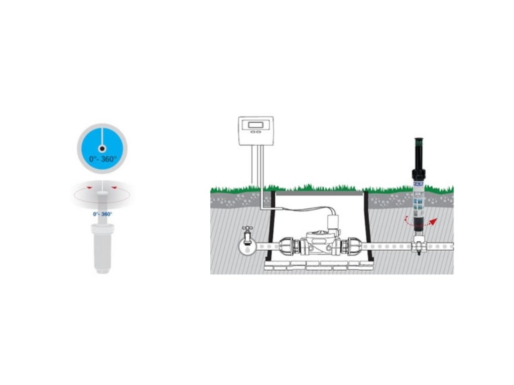 Postrekovač výsuvný nastaviteľný 0-360°. Vhodný na zabudovanie do automatických zavlažovacích systémov.Dostrek 3,9 až 4,6 metra, zavlažovací uhol 0-360o, výsuv 10 cm, pripojenie vnútorný závit 1/2", prietok 5,0-7,1L/min.