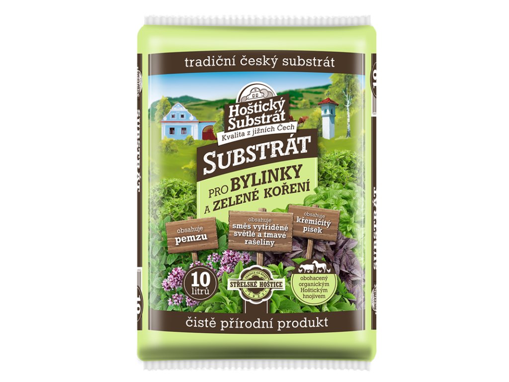 Hoštický substrát na bylinky a zelené korenie je špeciálne pripravený na výsev aj pestovanie byliniek a aromatických rastlín. Je vyrobený zo zmesi triedenej svetlej a tmavej rašeliny, pemzy, preosiateho jemne triedeného kremičitého piesku a organických hnojív, ktoré obsahujú hlavné živiny aj stopové prvky. Substrát neobsahuje minerálne (priemyselné) hnojivá a pôdna reakcia je upravená jemne mletým dolomitickým vápencom.