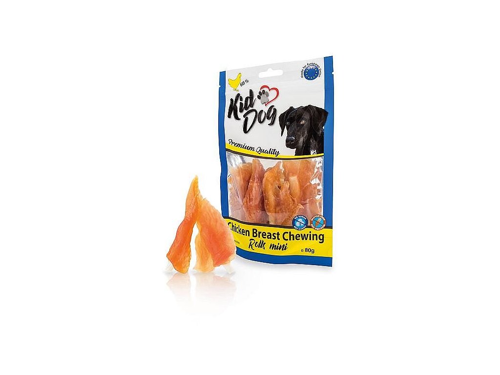 KD Kuracie prsia na byvolej tyčinke mini 80 g (9 cm) sú doplnkové krmivo pre psy vo forme žuvacej tyčinky z byvolej kože obalenej kuracím mäsom. Žuvanie prirodzene podporuje mechanické čistenie zubov a zároveň psa zabaví. Vhodné ako odmena aj ako pochúťka medzi jedlami, najmä pre trpasličie a malé plemená.