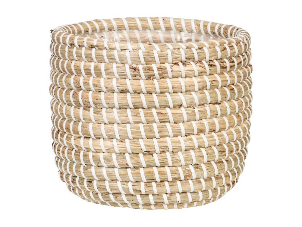 Košík z morskej trávy 513 17cm biely je dekoratívny obal na kvetináč do interiéru. Je vyrobený z pletenej morskej trávy opletený plastovým lemom v bielom prevedení a vo vnútri má vodotesnú fóliovú vložku, ktorá chráni košík pred presiaknutím vody.