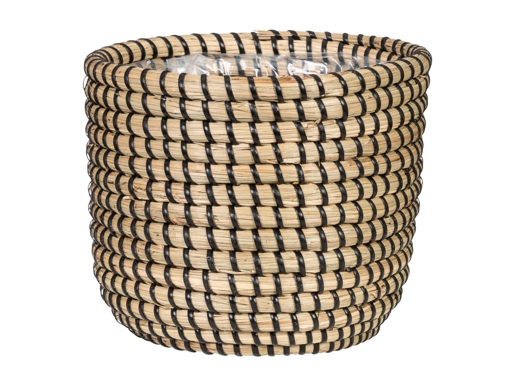 Košík z morskej trávy 513 17cm čierny je dekoratívny obal na kvetináč do interiéru. Je vyrobený z pletenej morskej trávy opletený plastovým lemom v čiernom prevedení a vo vnútri má vodotesnú fóliovú vložku, ktorá chráni košík pred presiaknutím vody.