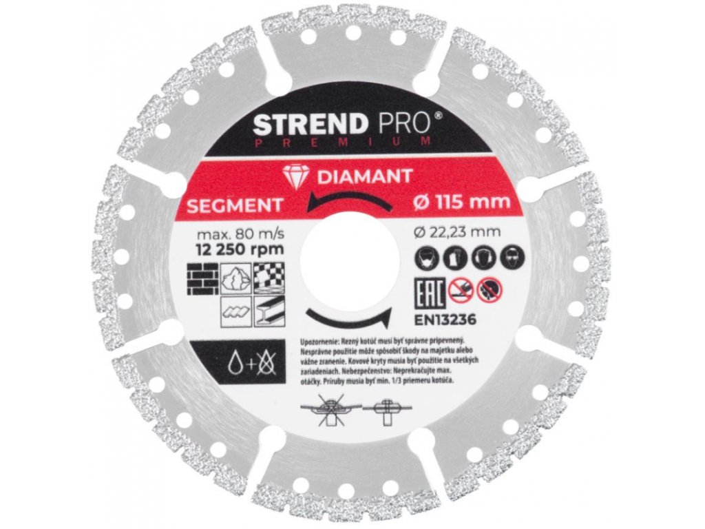 Diamantový rezný kotúč je určený pre domácich kutilov, ale aj pre profesionálnych remeselníkov. Vhodný je na mokré aj suché opracovávanie. Jeho použitie je rozsiahle - tehly, murivo, kameň, dlažba, obklad, strešná krytina, kov, plast, drevo, betón, železobetón, žula, mramor. Je potiahnutý abrazívnym materiálom pre vyšší výkon. Priemer je 115 mm a maximálne povolené otáčky sú 12250 rpm.
