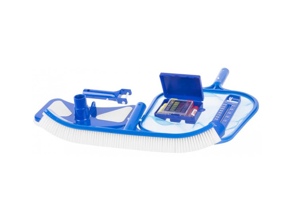 Praktická sada na údržbu bazénu obsahuje základné náradie, ktorého súčasťou je : kefa na tyč, vysávacia hlavica, teplomer, sieťka, sada testerov.Dodatočné parametre