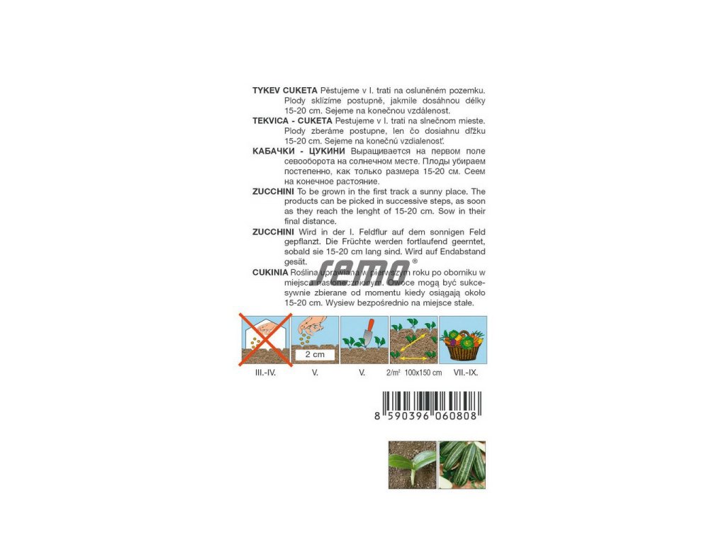 Hybridní cuketa s velmi kompaktním keříčkem. Atraktivní mladé Baby plody jsou světle zelené s krémově zelenými pruhy. Plody jsou velmi vyrovnané. Při sklizni na Baby plody, má velmi jemnou dužninu delikátní chuti. Baby plody jsou vhodné především pro pečení a grilování napůl rozkrojených plodů, přerostlé plody se mohou zpracovávat běžně jako cukety.Dodatočné parametre