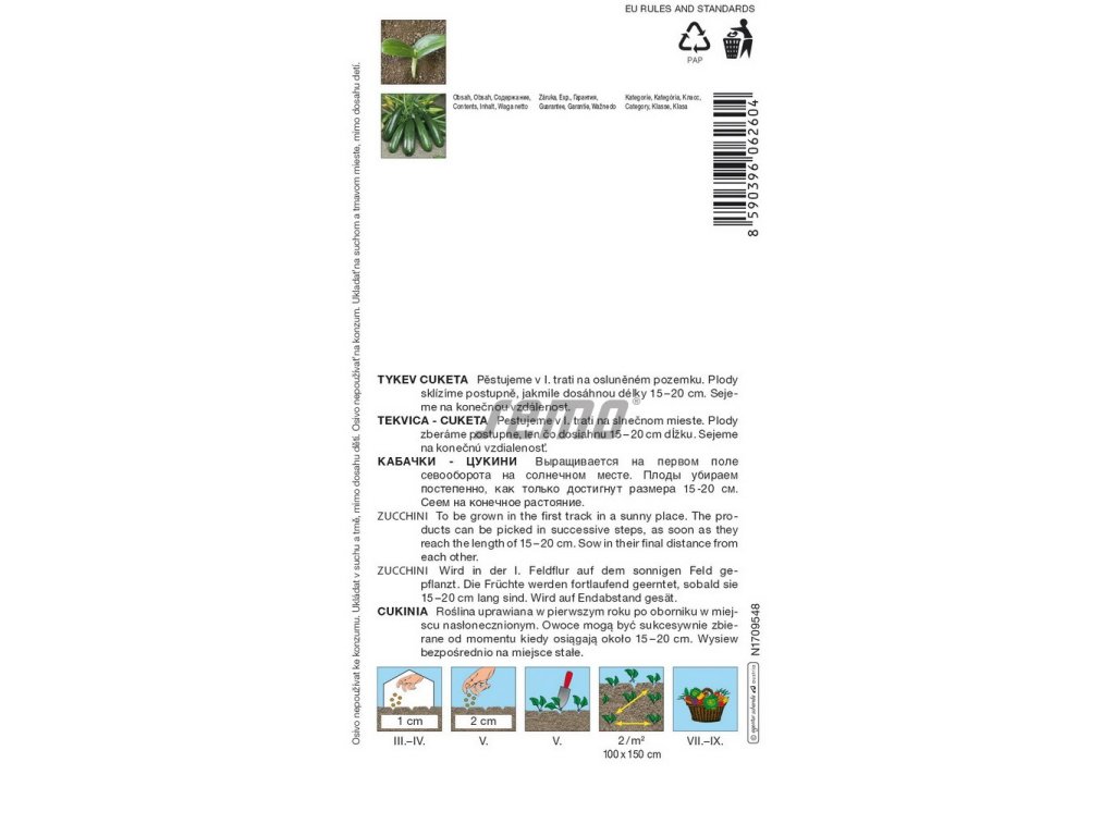 Velmi výnosná cuketa s kratšími válcovitými, tupě zakončenými plody středně zelené barvy s jemně síťovanou slupkou o délce 16 až 20 cm s vysokým podílem výběrových plodů. Velmi chutné lahůdkové plody jsou určeny pro intenzivní sklizeň během celé sezóny. Vykazuje vysokou polní toleranci k ZYMV (Zucchini Yellow Mosaic Virus – Virus žluté mozaiky cukety).Dodatočné parametre