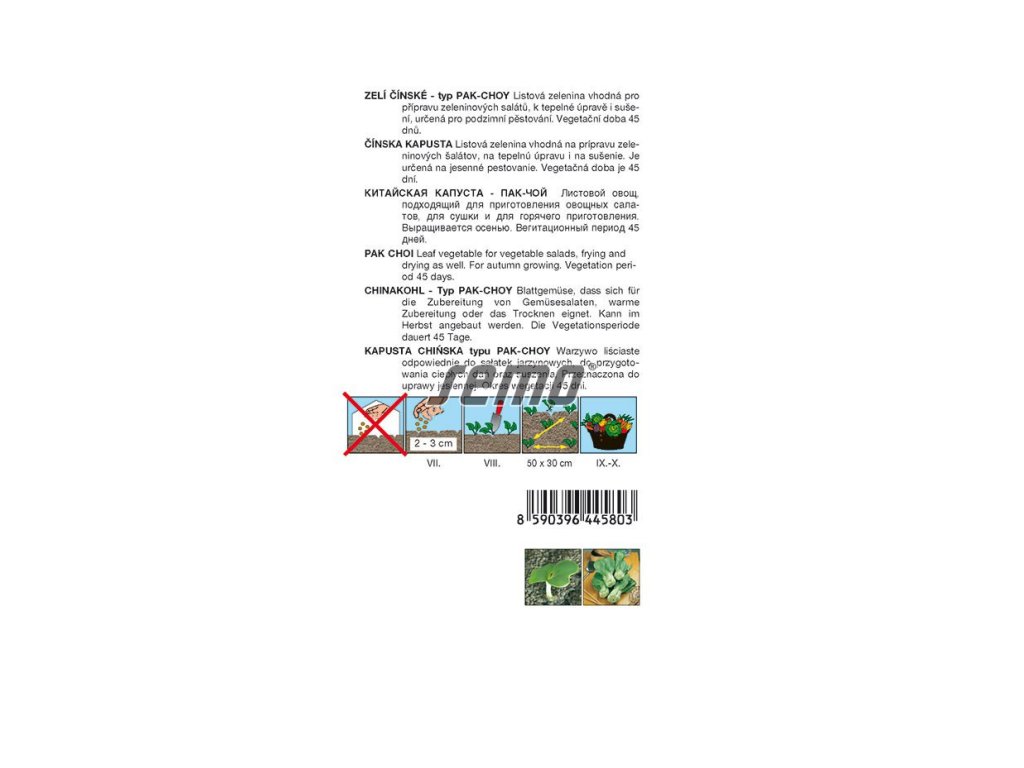 Čínské zelí Cash F1 (typ Pak-Choy) – řapíky jsou vhodné pro přípravu čerstvých listových salátů i pro tepelné zpracování, výborné do asijských polévek. Lze jej vysévat hustěji pro sklizeň mladých lahůdkových listů na čerstvé saláty. Vegetační doba 50 dní, pro produkci Baby listů 30 dní na jaře a na podzim, a 40 až 50 dní v zimě.Dodatočné parametre