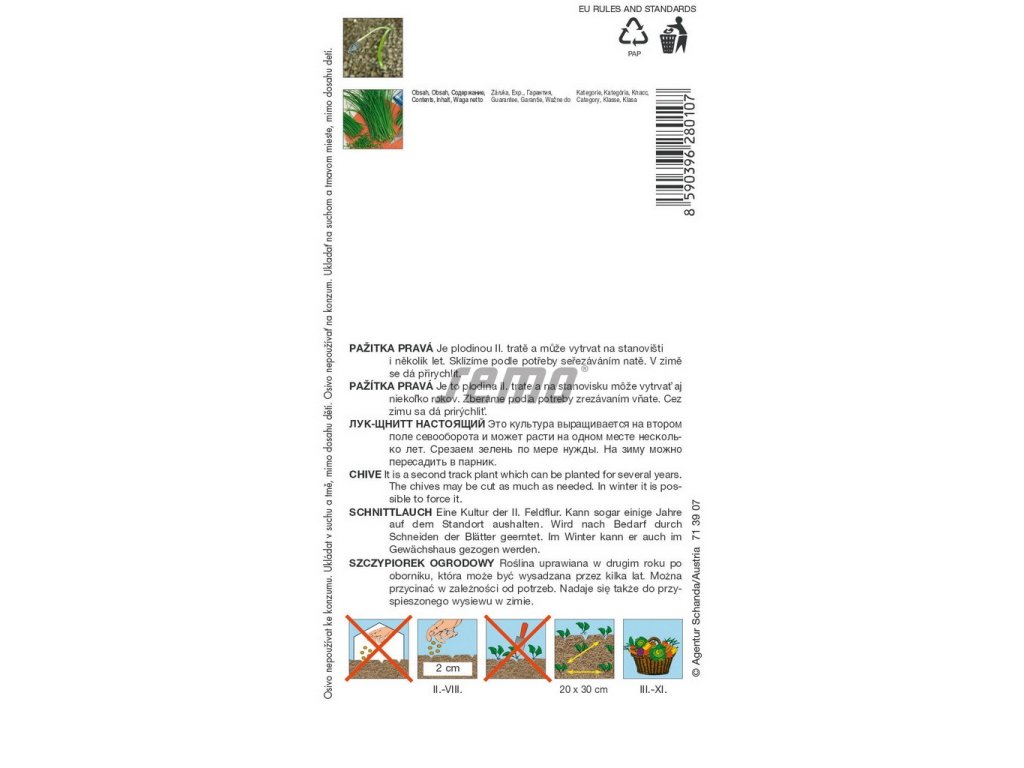 Semená vysievajte priamo na záhon alebo do kontajnerov v období február – august. Pažítka vyžaduje ľahšiu, dobre priepustnú pôdu a pravidelnú zálievku pre rovnomerný rast.