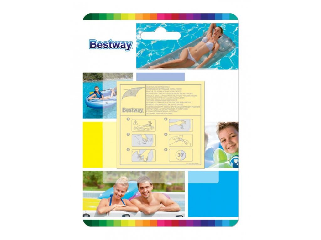 Opravné náplasti Bestway® na lepenie pod vodou sú rýchly a ľahký spôsob, ako opraviť prepichy na nafukovacích výrobkoch. Každé balenie obsahuje 10 odolných opravných náplastí, ktoré sú vynikajúce na opravu nafukovacích člnov, bazénov, víriviek a nafukovacích matracov. Opravné náplaste sú vodeodolné, čo vám umožňuje opraviť problémy pod čiarou hladiny vody napríklad na lodi, bazéne alebo vírivke.
