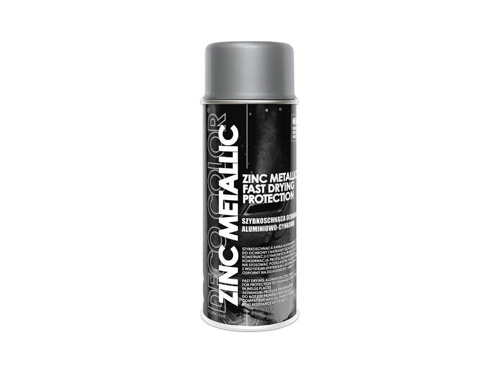 Sprej Decocolor Zinc Metallic 400 ml je rýchlo schnúci hliníkovo-zinkový prípravok určený na ochranu a opravy poškodených pozinkovaných konštrukcií najmä v miestach zvarov a rezov. Používa sa aj na údržbu hliníkových profilov a je vhodný pre povrchy pred aj po galvanizácii.