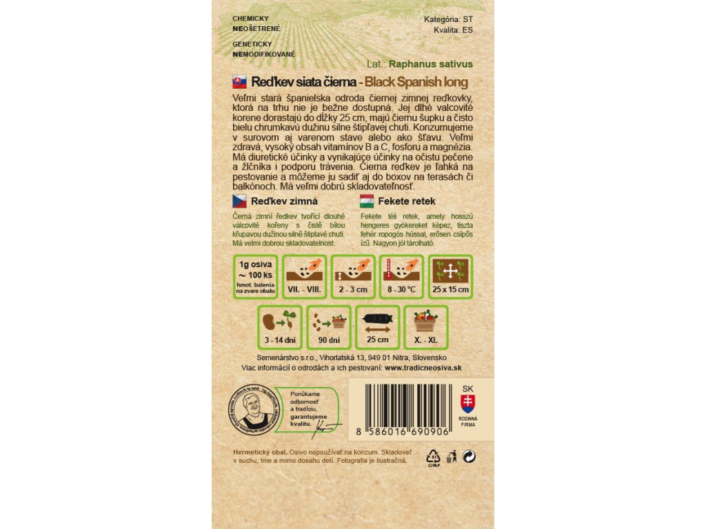 Veľmi stará španielska odroda čiernej zimnej reďkovky, ktorá na trhu nie je bežne dostupná. Jej dlhé valcovité korene dorastajú do dĺžky 25 cm, majú čiernu šupku a čisto bielu chrumkavú dužinu silne štipľavej chuti. Konzumujeme v surovom alebo varenom stave alebo ako šťavu. Veľmi zdravá, vysoký obsah vitamínov B a C, fosforu a magnézia. Má diuretické účinky a vynikajúce účinky na očistu pečene a žlčníka i podporu trávenia. Čierna reďkev je ľahká na pestovanie a môžeme ju sadiť aj do boxov na terasách či balkónoch. Má veľmi dobrú skladovateľnosť.