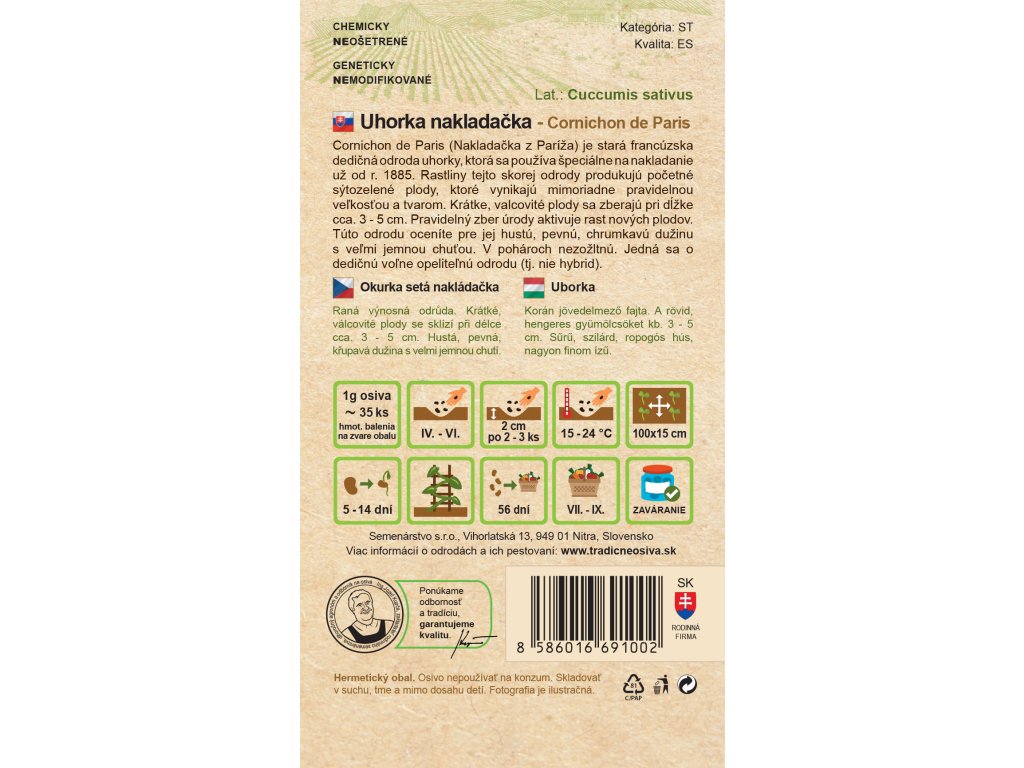 Cornichon de Paris (Nakladačka z Paríža) je stará francúzska dedičná odroda uhorky, ktorá sa používa špeciálne na nakladanie už od r. 1885. Rastliny tejto skorej odrody produkujú početné sýtozelené plody, ktoré vynikajú mimoriadne pravidelnou veľkosťou a tvarom. Krátke, valcovité plody sa zberajú pri dĺžke cca. 3 – 5 cm. Pravidelný zber úrody aktivuje rast nových plodov. Túto odrodu oceníte pre jej hustú, pevnú, chrumkavú dužinu s veľmi jemnou chuťou. V pohároch nezožltnú. Jedná sa o dedičnú voľne opeliteľnú odrodu (tj. nie hybrid).Dodatočné parametre