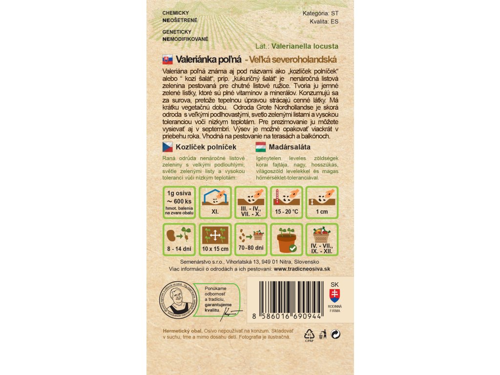 Valeriána poľná známa aj pod názvami ako „kozlíček polníček“ alebo “ kozí šalát”, príp. “kukuričný šalát“ je nenáročná listová zelenina pestovaná pre chutné listové ružice. Tvoria ju jemné zelené lístky, ktoré sú plné vitamínov a minerálov. Konzumujú sa za surova, pretože tepelnou úpravou strácajú cenné látky. Má krátku vegetačnú dobu. Odroda D’Olanda a Seme Grosso je skorá odroda s veľkými podlhovastými, svetlo zelenými listami a vysokou toleranciou voči nízkym teplotám. Pre prezimovanie ju môžete vysievať aj v septembri. Výsev je možné opakovať viackrát v priebehu roka. Vhodná na pestovanie na terasách a balkónoch.Dodatočné parametre