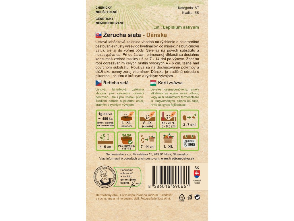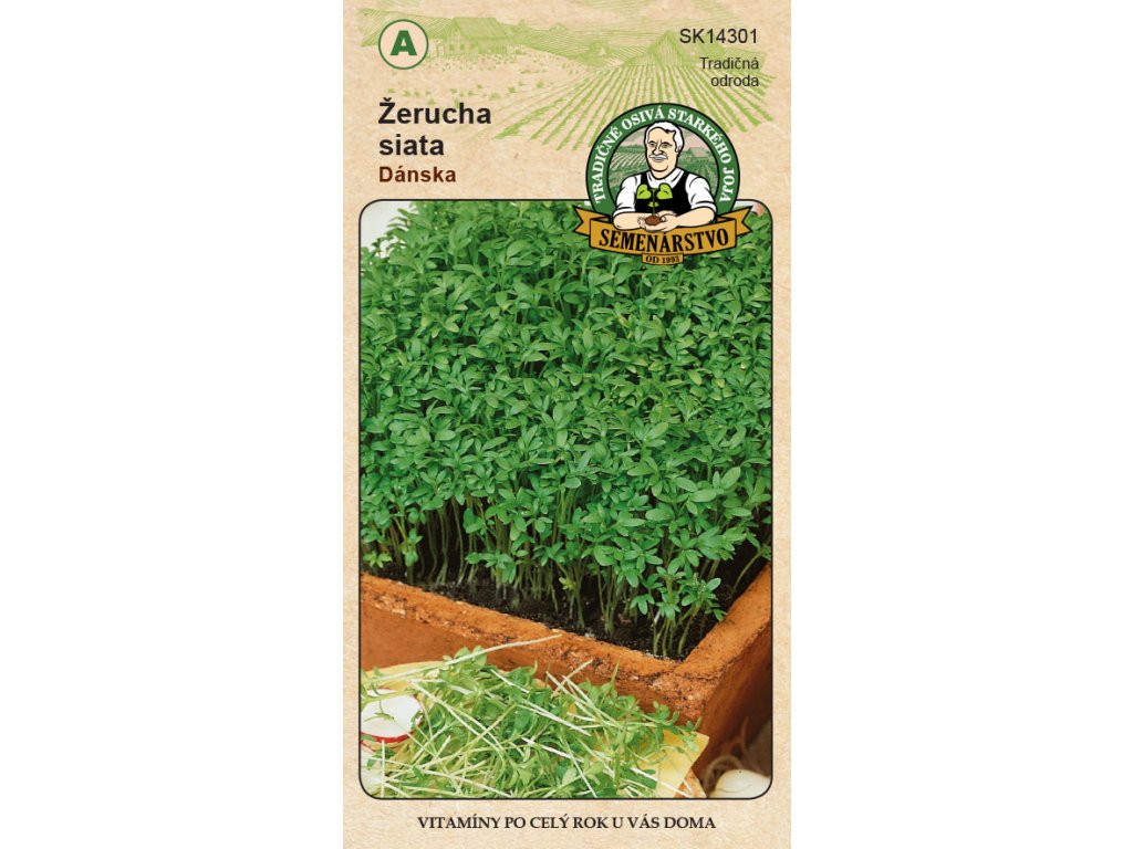 Listová lahôdková zelenina vhodná na rýchlenie a celororočné pestovanie (hustý výsev do kvetináčov, do misiek, na buničinovú vatu), ale aj do voľnej pôdy. Seje sa na povrch substrátu a nezasypáva sa. Pri udržiavaní primeranej vlhkosti sa dosiahne konzumná zrelosť rastliny už za 7 – 14 dní po výseve. Zber sa robí odrezávaním celých rastlín vysokých 4 – 6 cm, tesne nad povrchom substrátu. Používa sa na dochucovanie pokrmov a slúži ako cenný zdroj vitamínov. Dánska je tradičná odroda s pikantnou chuťou a krátkym a rýchlym vývojom.Dodatočné parametre